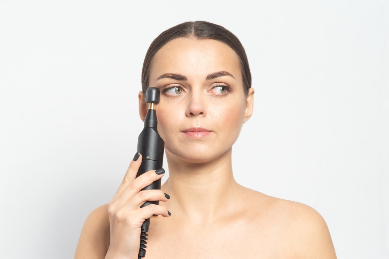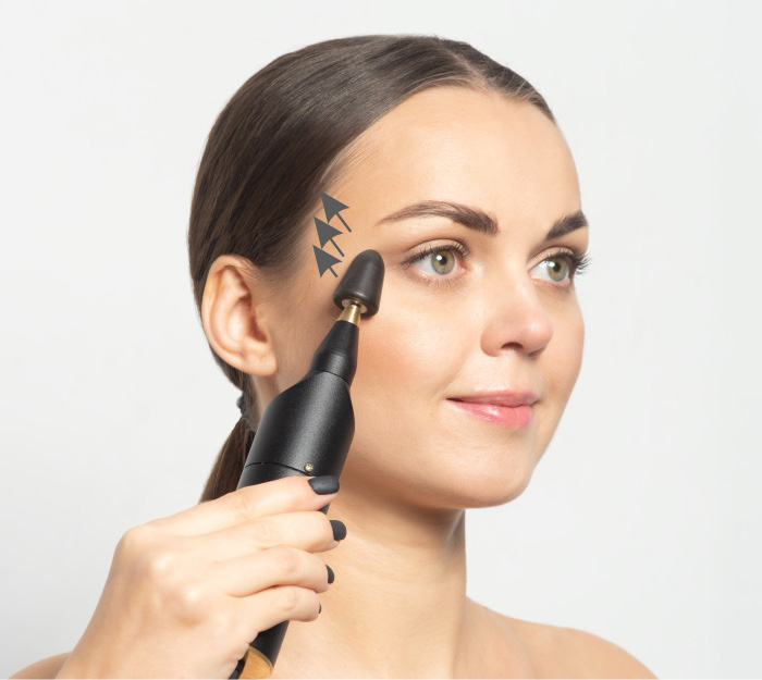 Вибротод приставляют вертикально к внешнему уголку закрытого глаза. Вибрация через кожу века передается к глазному яблоку, не травмируя его. Она, напоминаем, действует не в глубь глаза, а вдоль его поверхности, что обуславливается конструкцией устройства. Затем производятся движения глазами в разных направлениях: влево, вправо, вверх, вниз и круговые.