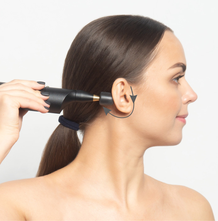 Поэтому при стимуляции затылочной и околоушной мышц необходимо растягивать их дополнительным усилием. Для этого достаточно наклонить голову вперед при стимуляции области апоневроза вблизи затылочной мышцы или в сторону при стимуляции области околоушных мышц.