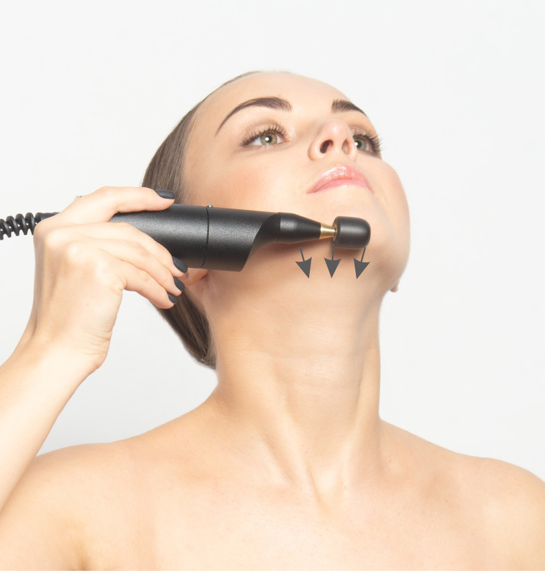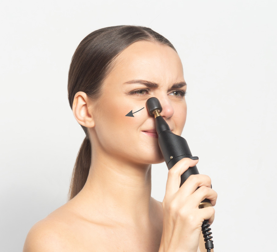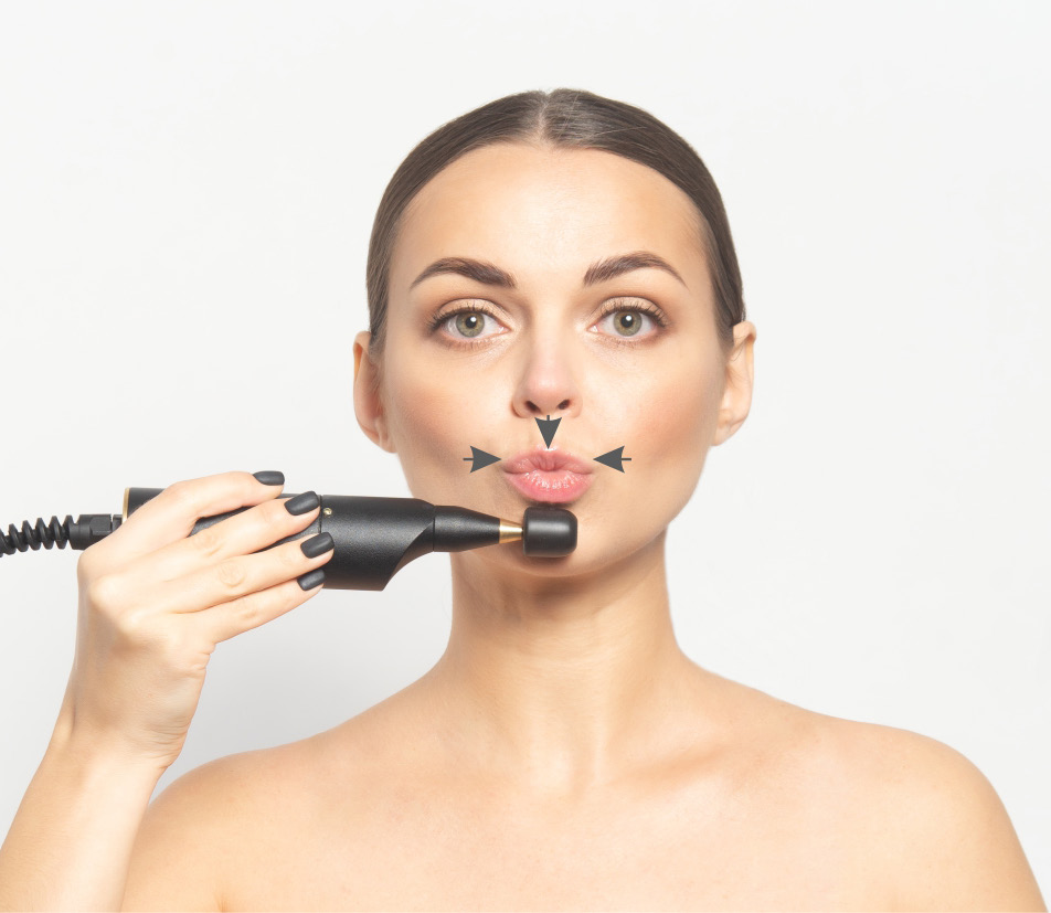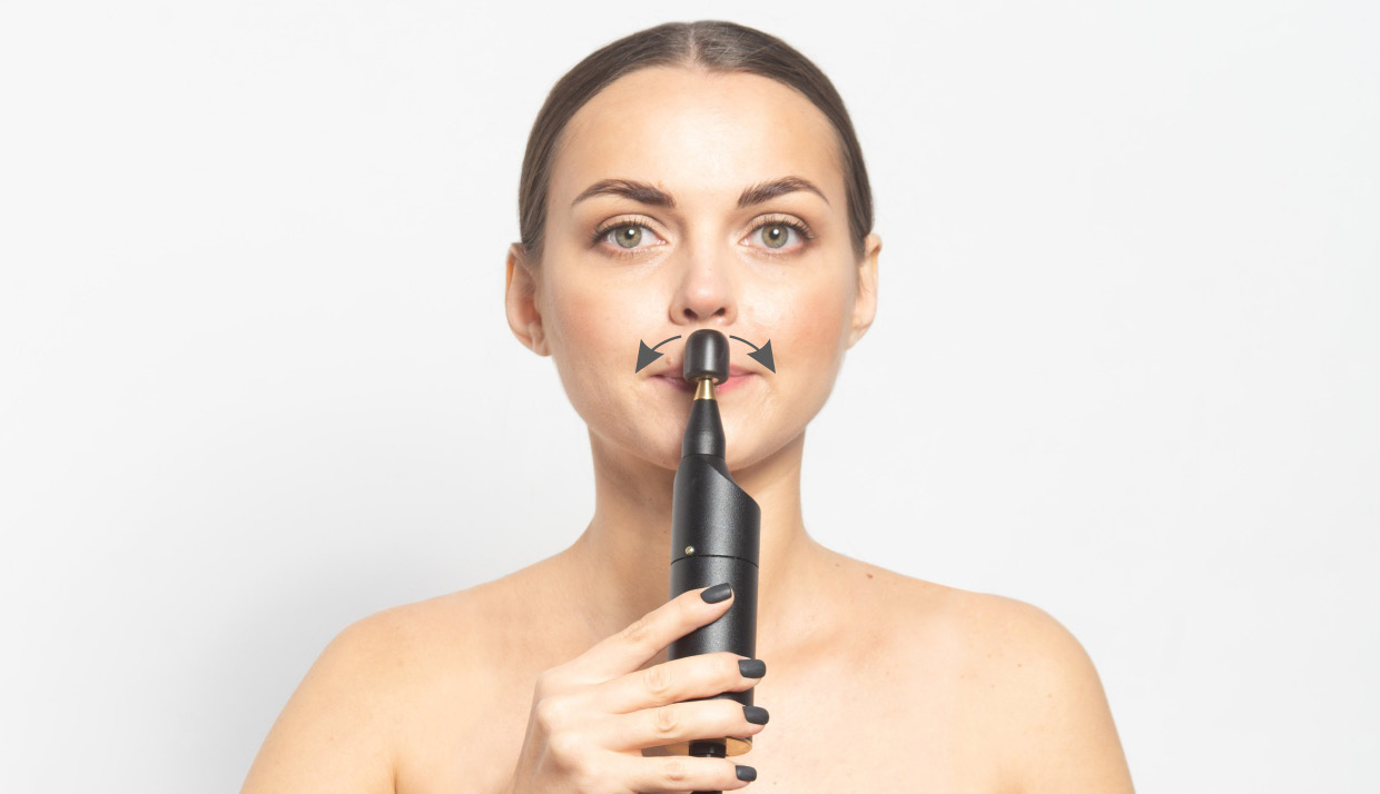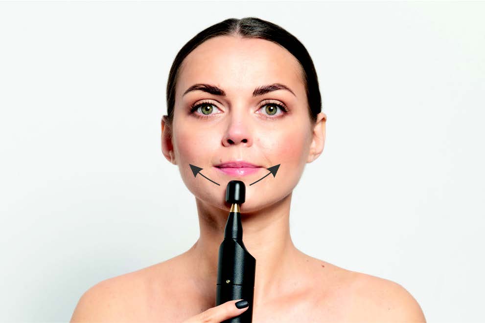 Часть 3. Вибратод вертикально прикладываем в область под верхней губой в центральной части и производим стимуляцию в направлении от центра влево, от центра вправо.