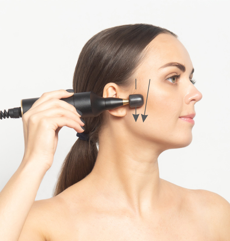 Стимулируем собственно жевательную и скуловую мышцы. Их напрягаем, сжимая зубы, а стимуляцию осуществляем сверху вниз.
